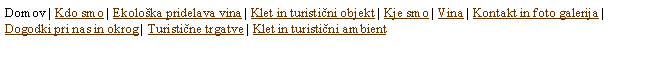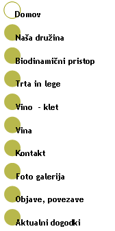 NUDIMO VAM: DEGUSTACIJE v slovenskem, hrvaškem, nemškem, angleškem in francoskem jeziku z ogledom kleti po predhodnem naročiu. PRODAJA buteljčnih biodinamičnih vin, namenjena tudi kot poslovna in druga darila; tudi v ekskluzivnih lesenih škatlicah. HRANA; domači zelenjavni in mesni narezki z različnimi namazi, domača sirova ali orehova gibanica, kisle juhe, krače... TURISTIČNE TRGATVE OGLED ampelografske vrste s približno 100 različnimi sortami vinske trte. |